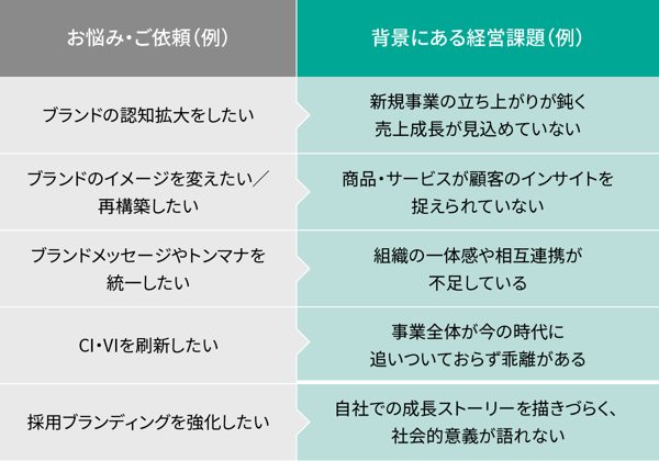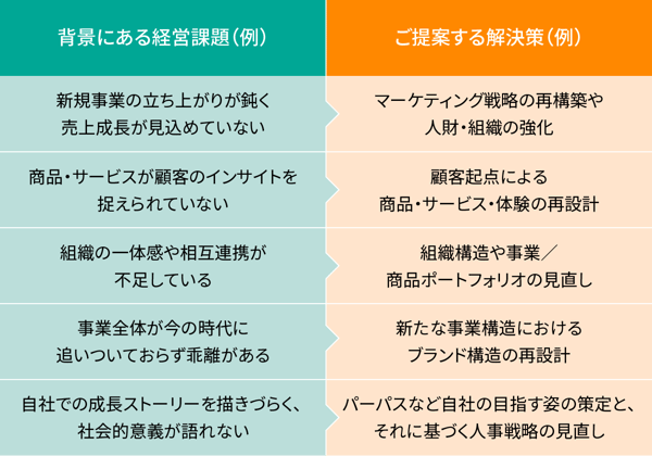 このように、企業がブランディングの課題だと捉えていることが、実は経営課題であるというケースが増えています。ブランディングの課題は、コミュニケーション上の課題としてだけではなく、経営課題として捉えるべきものになっているのです。そのため、こうした悩みをご相談いただいた際には、例えば次のような解決策をご提案し、解決に向けて伴走させていただくことが増えています。