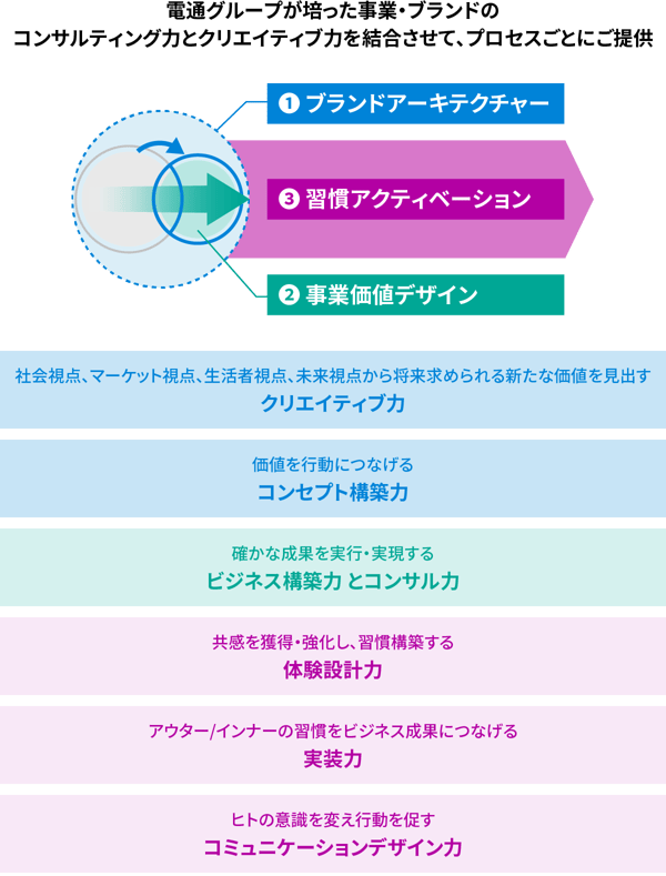 コンサルティングとクリエイティブが融合した多彩な視点からのご支援が、電通ならではの強みです。発想力、コンセプト構築力、ビジネス構築力、体験設計力、実装力、コミュニケーションデザイン力……それぞれのエキスパートが伴走しながら、事業変革の成果へとつながるブランディングの実現をご支援します。
