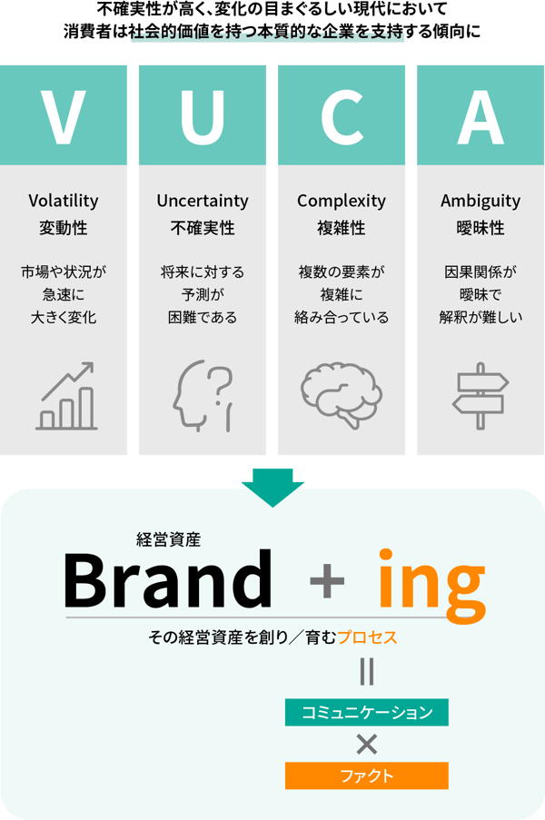 従来のブランディングは、広報や広告部門によるマーケティングコミュニケーションとしての戦略が主でした。しかし、不確実性が高く変化の目まぐるしい現代(VUCAの時代)において、消費者は社会的価値を持つ企業に高い関心を示し、本質を判断するようになっています。そのため、表層的な行動だけでは信頼されず、ブランディングにおいて、従来のコミュニケーション活動だけでなく、ブランドを体現する組織/事業面での“ファクト”を伴うことが必須になっています。