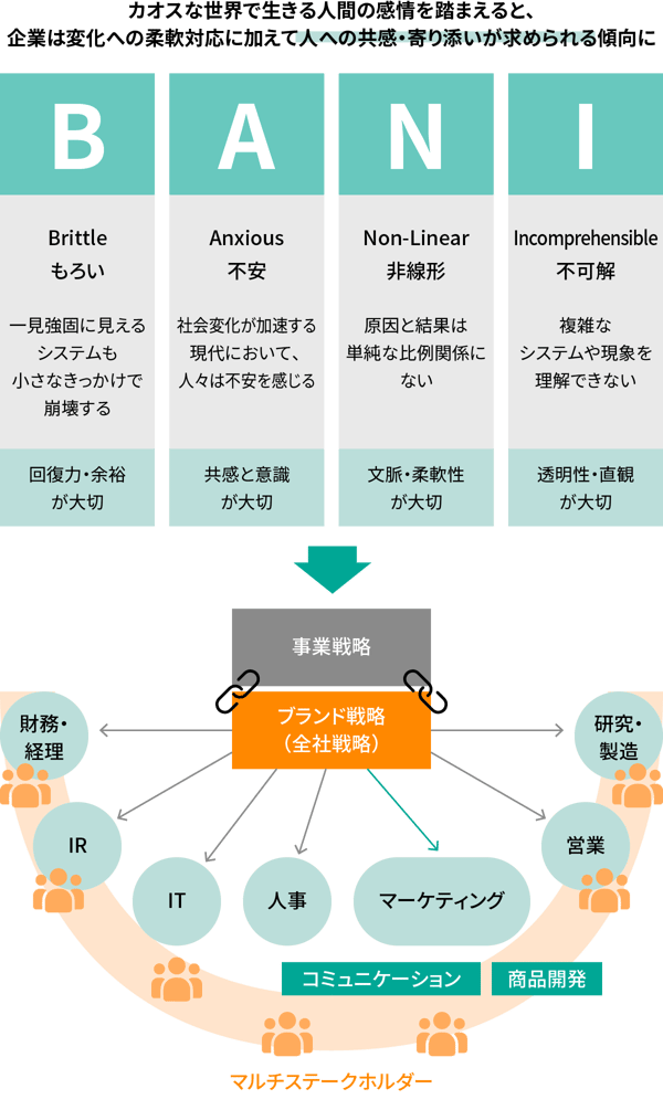 さらにコロナ以降、カオスな世界で生きる人間の感情の高まり(「BANIの時代」と呼ばれています)の中で、人への共感や寄り添いがより大切になっています。企業には、変化への柔軟対応に加えて人への共感・寄り添いが求められる傾向にあります。全社戦略として、ブランディングの対象を顧客だけでなく社員、株主、取引先、学生、地域、社会全体などマルチステークホルダーに拡大し、働きかけていくことが重要になっています。