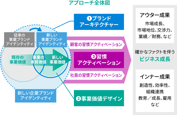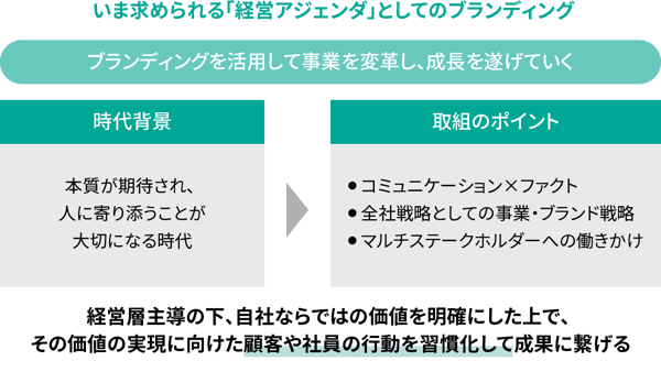 今求められている「経営アジェンダ」としてのブランディングとは、自社ならではの本質的な価値と新しい価値を明確にし、その価値の実現に向けて事業変革・成長を実現するために、ブランディングの力を活用して、顧客や社員の行動の習慣化にまでつなげていくことです。それに取り組むことが、事業変革や事業成長の鍵になっているのです。