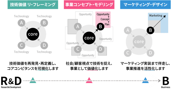 価値規定/機会発見/実装という取り組みを、技術価値リ・フレーミング/事業コンセプト・モデリング/マーケティング・デザインという3つのコンポーネントで捉え、それぞれを一体的に運用。技術価値の最大化を図っています。