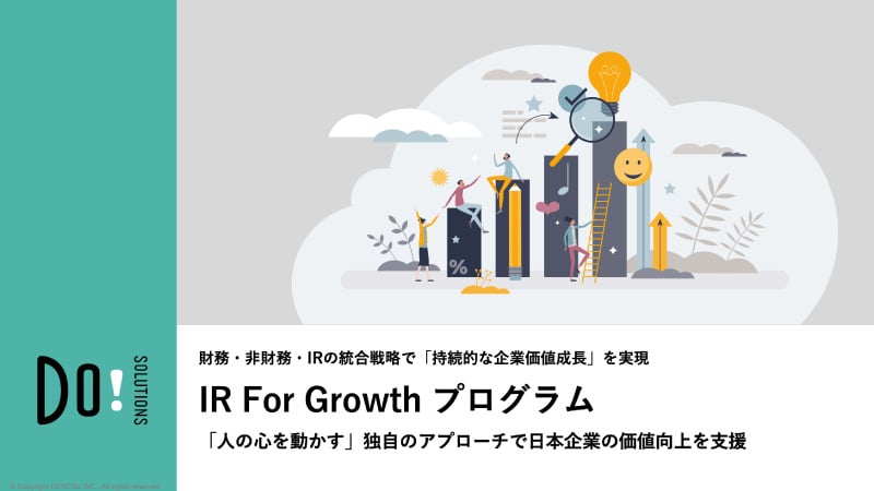 財務/非財務/IRの統合戦略で企業価値成長ストーリーを描き、企業価値向上/PBR向上につなげます。電通グループ各社のアセットとパートナー企業の専門的知見を融合し、支援します。