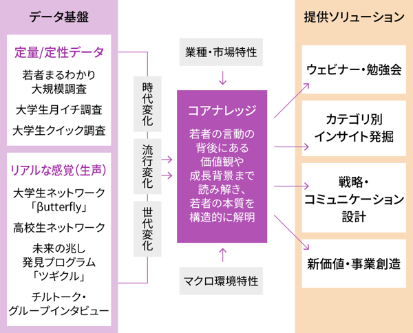 その基盤をもとに、若者の価値観から導いた未来仮説を軸として、 マーケティング、事業開発、採用、組織変革といった多領域にわたるソリューションをご提供します。