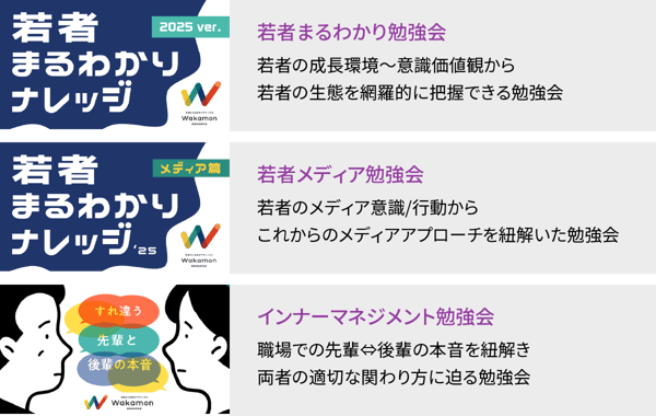 「若者まるわかりナレッジ」を活用した勉強会や講演、ワークショップを実施します。チーム・組織内で共通の「若者像」や「価値観言語」を持つことで認識のズレを解消し、迅速かつ確度の高い意思決定を可能にします。単なる知識の共有にとどまらず、マーケティングから事業開発、採用、組織づくりにおいて、若者インサイトを「現場で使える判断基準」へと変換し、マーケティング人財育成や組織全体の推進力向上を支援します。