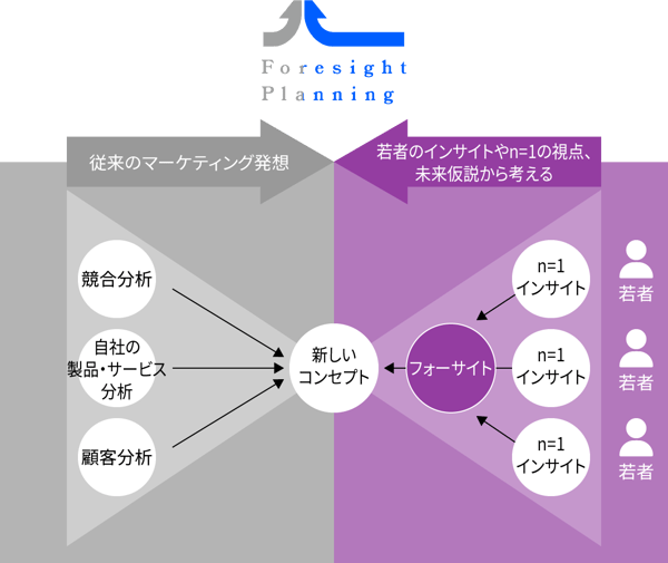 若者を「新しい価値観で行動する人たち」と定義し、社会変化を先取りする彼らの価値観から、数年先の市場や文化を左右する「未来の兆し」を読み解く独自の『フォーサイトプランニング』を実施します。現在の延長線上では捉えきれない変化の方向性を明示し、企業が進むべき次のテーマを導く「未来仮説」を構築。さらに、その仮説を新規事業、ブランド、商品・サービスの核となるコンセプトへと昇華させ、若者の共感と行動を引き出す価値設計によって戦略やプロジェクトを具体化します。
